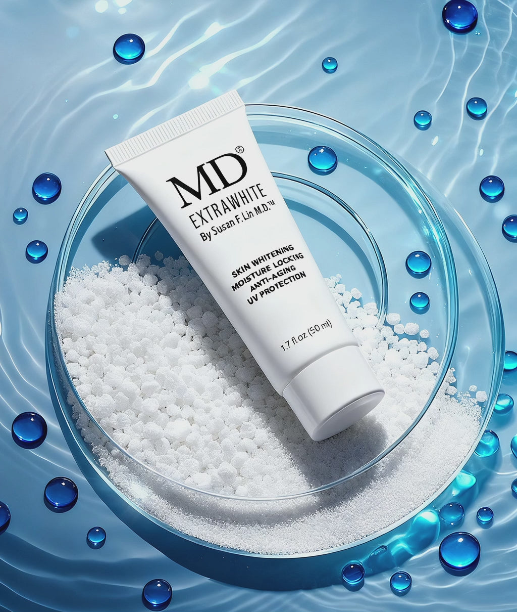 MD Extra White combines medical-grade ingredients—tranexamic acid, alpha arbutin, titanium dioxide, and Syn-Coll peptides—for multi-targeted action: brightening, anti-aging, hydration, and sun protection in one.